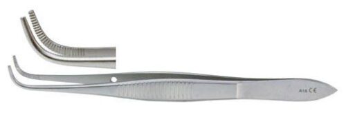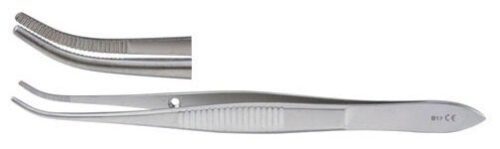 Miltex Eye Dressing Forceps, 4″ (100mm), Standard Pattern, Half Curved, 0.8mm Wide Serrated Tips