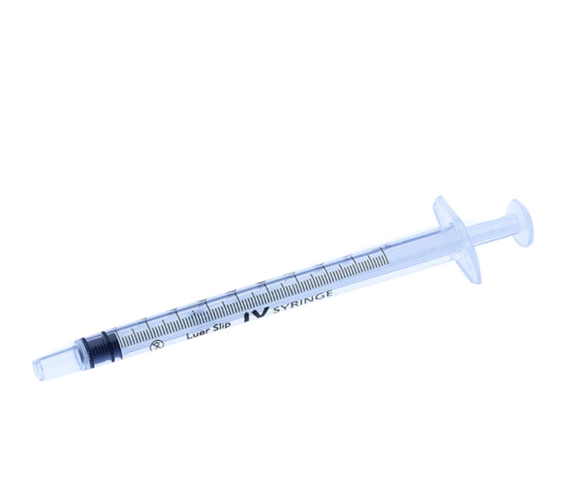 1 mL all-plastic disposable syringe with a Luer-slip tip, designed for laboratory fluid handling and use with syringe filters. Constructed with a polyethylene barrel and plunger for reliable, single-use performance.